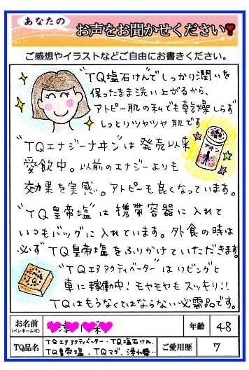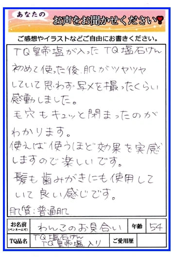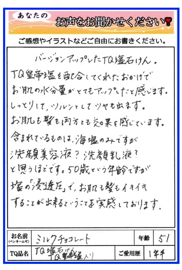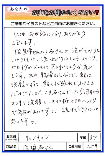 TQ塩石けんはお肌を清浄にし、ひきしめます。 |